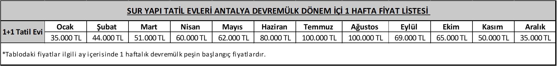 “Vadeli ödeme planımızdan yararlanmak isteyenler, toplam tutarın yüzde 35’ini peşin verdikten sonra kalan tutarı vade farksız 24 eşit taksitle ödeyebiliyor. Devre mülk fiyatları, bulunduğu kata, cepheye, metrekareye ve seçilen tarihe göre değişiyor. Sur Yapı Tatil Evleri Antalya’da devre mülk tapusu, hissesi oranında ve satın alırken belirlediği tarih aralığındaki kullanım haklarıyla tümüyle kişinin kendisine aittir.” Detaylı bilgiyi “tatilevleriantalya.suryapi.com.tr” adresinde bulabilirsiniz.