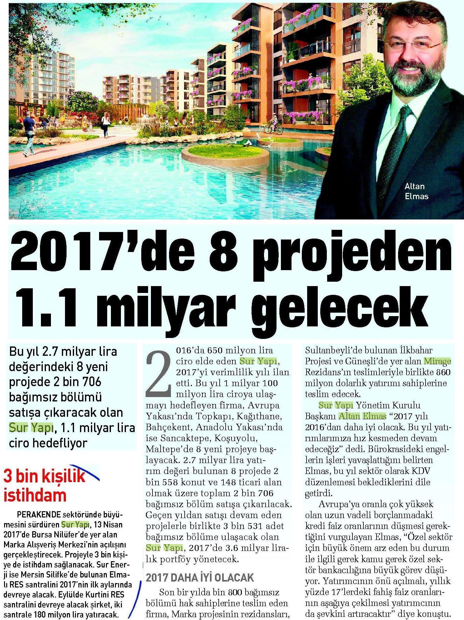 2017'de 8 Projeden 1.1 Milyar TL Gelecek