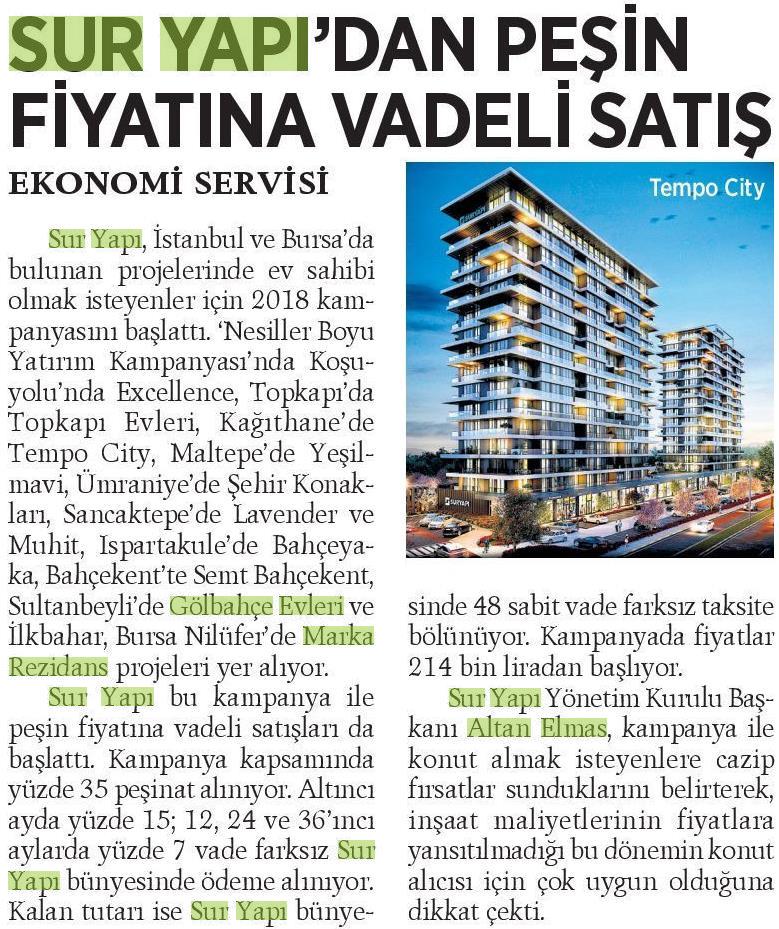 Sur Yapı'dan Peşin Fiyatına Vadeli Satış