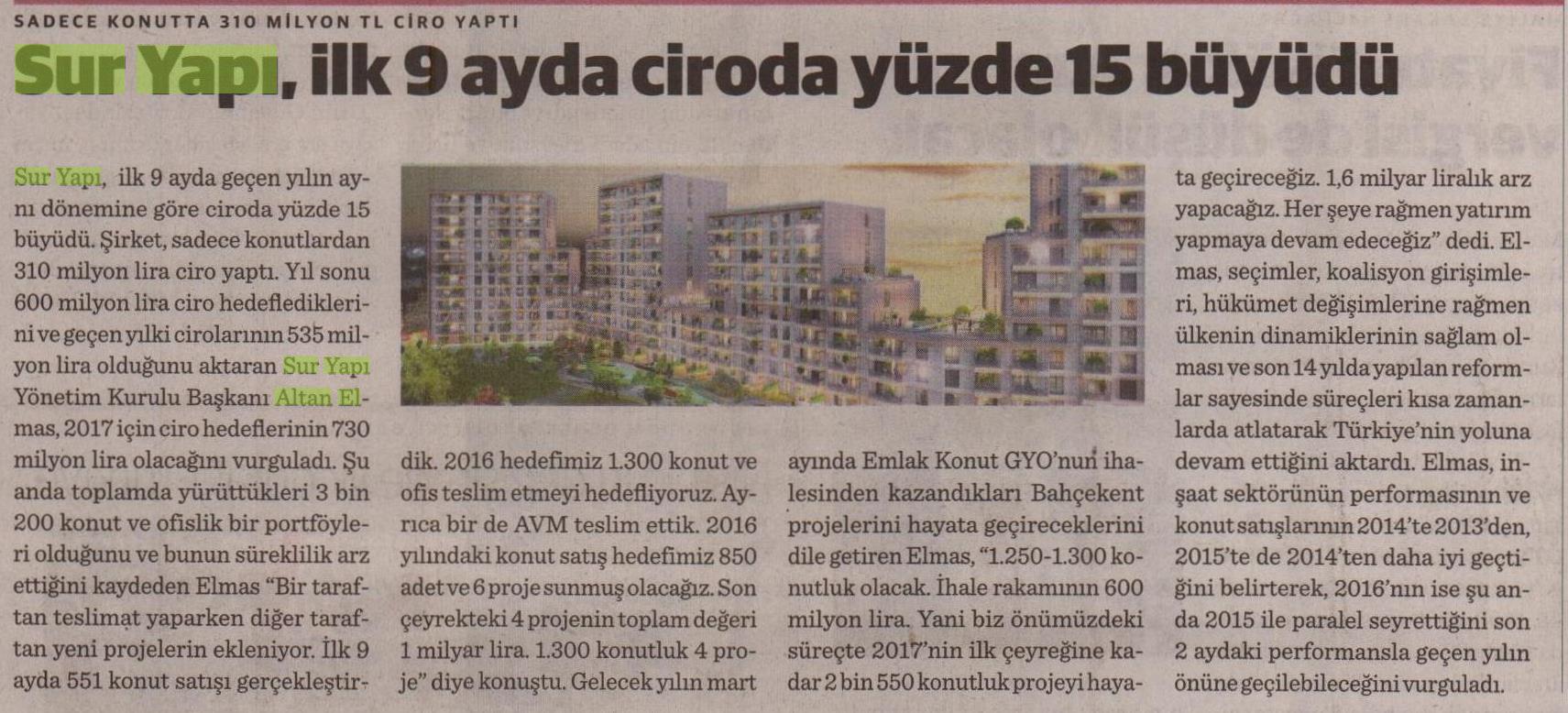 Sur Yapı İlk 9 Ayda Ciroda Yüzde 15 Büyüdü