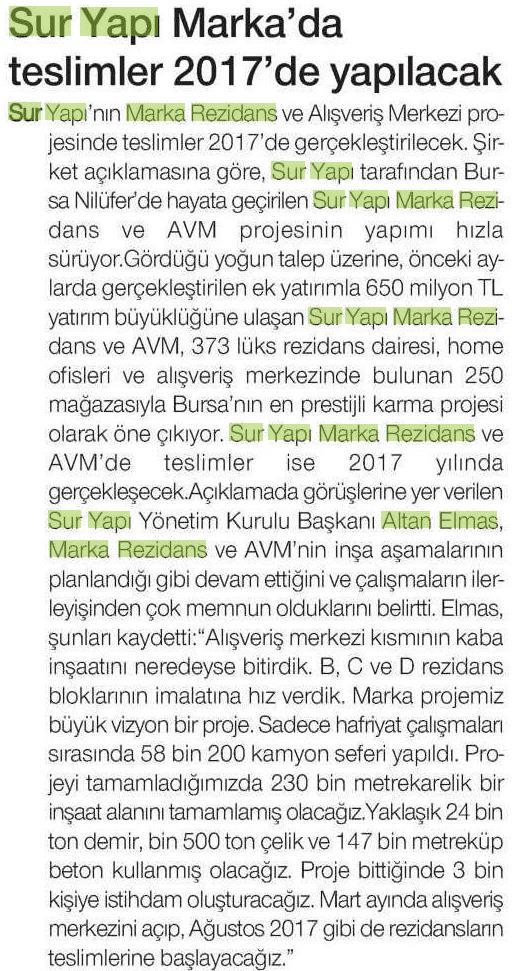 Sur Yapı Marka'da Teslimler 2017'de Yapılacak