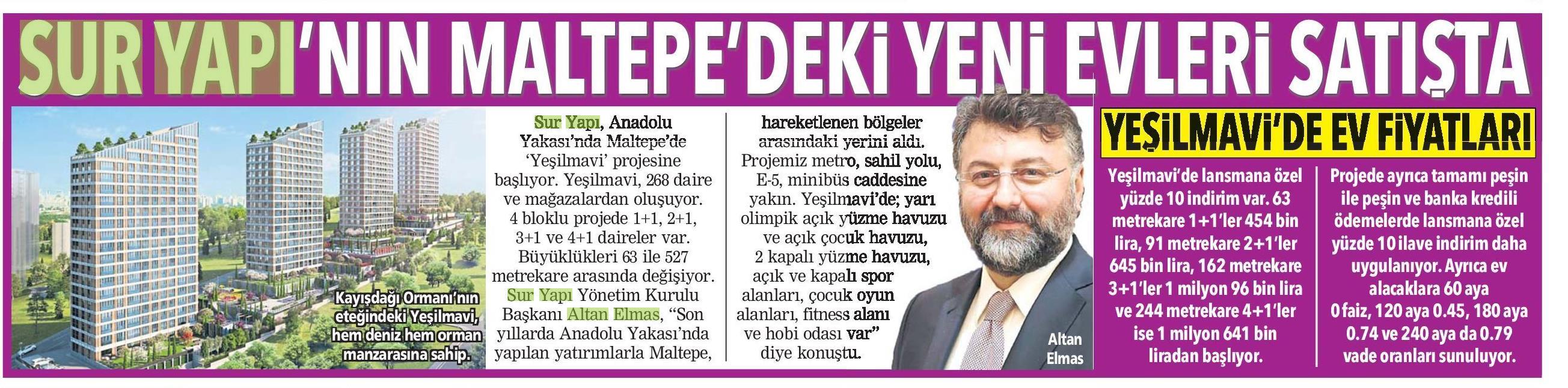 Sur Yapı'nın Maltepe' Deki Yeni Evleri Satışta