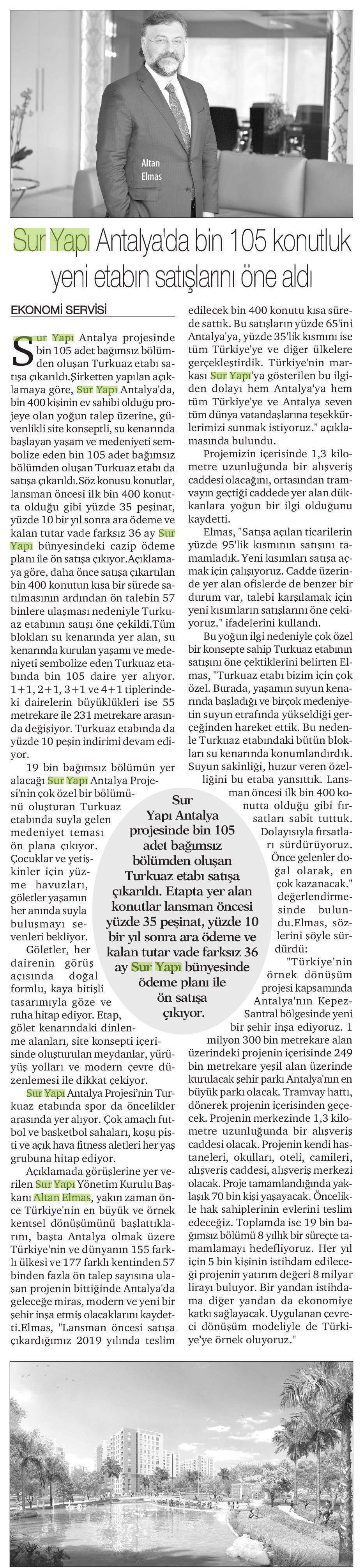 Sur Yapı Antalya'da Bin 105 Konutluk Yeni Etabın Satışlarını Öne Aldı